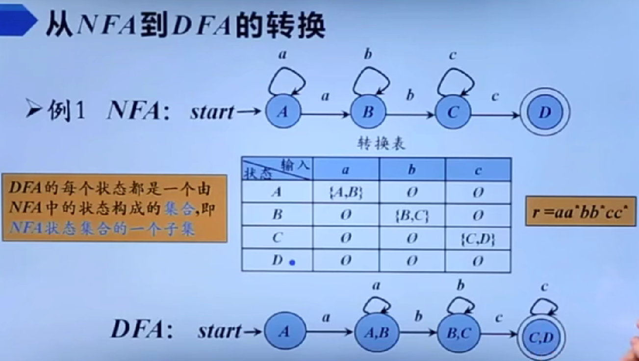 - 确定型有穷自动机(DFA, Deterministic Finite Automaton):对于每个状态和输入符号,转移函数 δ 定义了唯一一个确定的下一个状态。